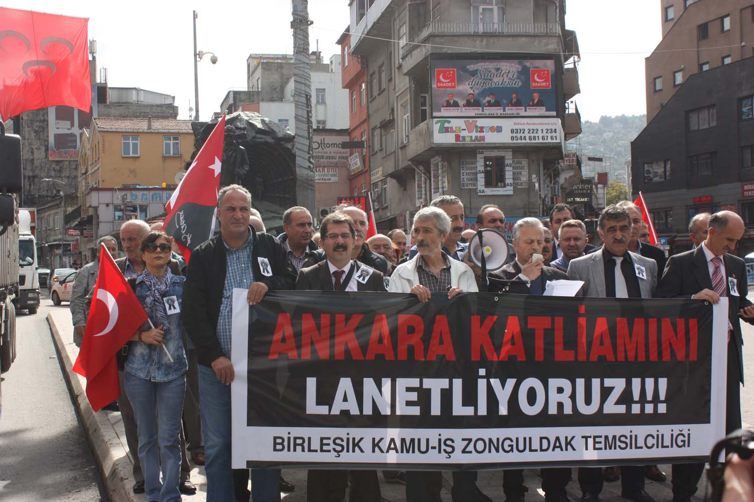 Birleşik Kamu-İş Ankara’da düzenlenen Barış, Demokrasi ve Emek mitingine düzenlenen bombalı saldırıda da yaşamını yitirenler anısına ve katliamın sorumlarını protesto amacıyla Zonguldak’ta Madenci Anıtı’nda basın açıklaması yaptı.Açıklamayı Birleşik Kamu-İş adına Eğitim-İş Zonguldak Şube Başkanı Metin Kahveci yaptı, Kahveci açıklamasın da şu görüşleri dile getirdi, “ Cumhuriyet’in Başkenti Ankara’da çeşitli demokratik kitle örgütlerinin ve siyasi partilerin düzenlemiş olduğu mitingde, Tren Garı önünde en az iki ayrı yerde meydana gelen patlamada 100’e yakın yurttaşımızın yaşamını kaybetmesine ve yüzlerce yurttaşımızın yaralanmasına neden olan terörü bir kez daha lanetliyoruz. 7 Hazirandan bu yana ülkemizin her yerinden çığlıklar yükselmekte, yüreğimize ateş düşmekte, içimiz yanmaktadır. Emperyalizmin emrindeki terör örgütlerinin kanlı yüzünü bir kez daha ortaya koyan bu alçakça saldırıları şiddetle kınıyoruz.