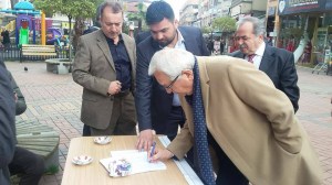 Çaycuma’ya ziyaretlerde bulunmak için gelen Kdz. Ereğli eski Belediye Başkanı Halil Posbıyık Çaycuma Çarşı Meydanında açılan “Öğretmenlerimizi Geri İstiyoruz” imza standını ziyaret ederek imza metnine imza attı. Eğitim Sen Şube Sekreteri İsmet Akyol ve Çaycuma Temsilcisi Gökhan Taner Günsan’a geçmiş olsun dileklerini ileten Posbıyık yaşanan mağduriyetin bir an önce sona ermesi gerektiğini söyledi.