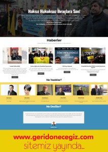 geridonecegiz.com” sitesi yayına başladı. Sitede ihraç edilen Eğitim Sen Çaycuma Baştemsilcisi Gökhan Taner Günsan ve Eğitim Sen Zonguldak Şube Sekreteri İsmet Akyol’un ihraç edilmesinden bugüne kadar ihraçlara ilişkin yerel ve ulusal basında çıkan haberler; gazeteciler, yazarlar, şairler, milletvekilleri, belediye başkanları, öğrenci velileri, öğretmenler, esnaflar, siyasi parti, sendika, dernek ve meslek örgütü temsilcileri başta olmak üzere toplumun farklı kesimlerinden kişilerin yazıları, görüşleri ve değerlendirmeleri yer alıyor.