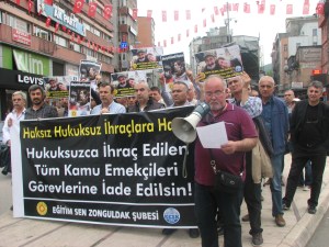 Eğitim Sen Zonguldak Şubesi tarafından Madenci Anıtında haksız ve hukuksuz ihraç edilen tüm emekçilerin görevlerine iade edilmeleri ve “işimi geri istiyorum” talebiyle süresiz açlık grevindeki Eğitim Sen üyesi Nuriye Gülmen ve Semih Özakça’nın sağlıklı biçimde yaşamlarına devam edebilmeleri talepleriyle basın açıklaması yaptı.