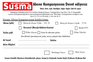 Susma Gazetesi, 21 yıldır yaşamını gönüllü okurların desteğiyle sürdürüyor.Susma’yı Güçlendir Sende Güçlü ol, mesajıyla tüm dost ve arkadaşları Susma’ya abone olmaya davet ediyoruz.
