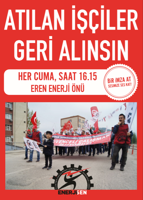 DİSK’e Bağlı Enerji-Sen ve Limter-İş’e üye oldukları için işten atılan Eren Enerji işçileriyle ilgili olarak her Cuma Santral önünde gerçekleşen basın açıklaması bu kez işten atılanların geri alınması için İmza kampanyası başlatılıyor.Enerji-Sen Genel Sekreteri Süleyman Keskin basına ve kamuoyuna yaptığı duyuruda, “Eren Enerji şirketinde sendikalı oldukları için işten atılan 13 işçi aileleri ile Cuma Saat 16:15 de Eren enerji kapısında Disk Enerji-Sen ve Limter-İş sendikaları olarak bir basın açıklaması gerçekleştireceğiz. Atılan işçiler geri alınsın diye başlatacağımız imza kampanyasının basın açıklamasında başlangıcını da yapacağız. tüm emek dostlarını dayanışma sesimizi tüm Zonguldak halkına ulaştırmaya çağırıyoruz.”dedi