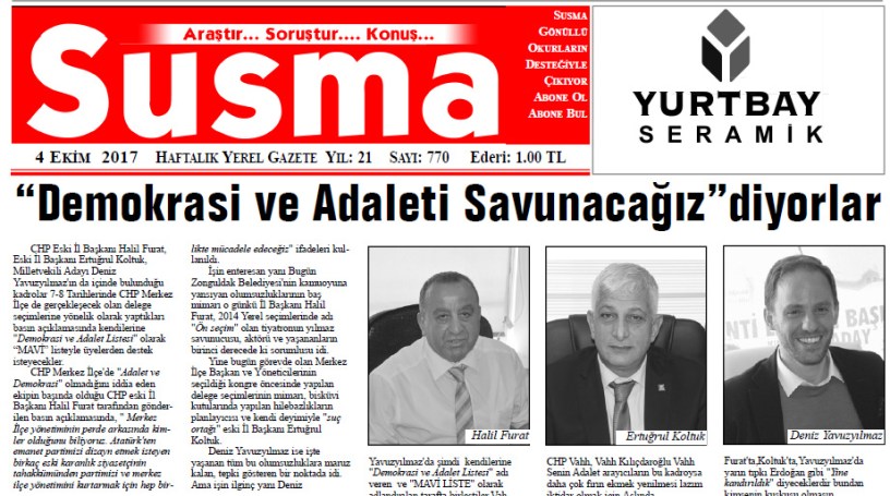 CHP Eski İl Başkanı Halil Furat, Eski İl Başkanı Ertuğrul Koltuk, Milletvekili Adayı Deniz Yavuzyılmaz’ın da içinde bulunduğu kadrolar 7-8 Tarihlerinde CHP Merkez İlçe de gerçekleşecek olan delege seçimlerine yönelik olarak yaptıkları basın açıklamasında kendilerine “Demokrasi ve Adalet Listesi” olarak “MAVİ” listeyle üyelerden destek isteyecekler.