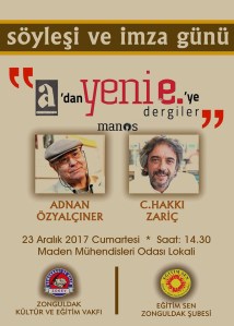 Zonguldak Kültür ve Eğitim Vakfı (ZOKEV) yeni bir edebiyat etkinliğine daha imza atıyor. Türk edebiyatının usta ismi Adnan Özyalçıner son dönemlerin beğenilen şairi C. Hakkı Zariç ile birlikte “a’dan yeni e.’ye dergiler” başlıklı söyleşi için Zonguldak’a geliyor. TMMOB Maden Mühendisleri Odası Lokalinde, 23 Aralık Cumartesi günü yapılacak olan söyleşi, saat 14.30’da başlayacak. Eğitim-Sen Zonguldak Şubesi ile ortaklaşa gerçekleştirilen etkinlik, bir sonraki gün de Çaycuma’da yapılacak. 24 AralıkPazar günü, Çaycuma Belediyesi SEKA Sosyal Tesislerindeki etkinlik de 14.30’da başlayacak. 1950’li yıllarda, dönemin baskıcı koşullarına tepki olarak yayınlanan “a” dergisinin kurucu kadrosu içinde yer alan usta öykücü Adnan Özyalçıner, şair C. Hakkı Zariç ile birlikte, OHAL’e dayanılarak, birçok kültür-sanat dergisinin hukuksuz şekilde kapatılmasına tepki olarak yayın hayatına başlayan “yeni e.” dergisinin de yazar kadrosu içinde yer alıyor.Etkinlikte Türkiye’deki gerici iktidarların, 60 yılı aşkın süredir kültür-sanatdergilerine karşı yürüttükleri baskıcı uygulamalar bir deneyim olarak anlatılacak. Yazarlar, söyleşinin ardından, Manos Yayınları arasında çıkan kitaplarını da imzalayacak.