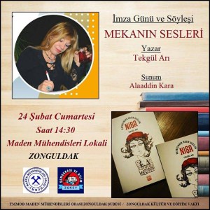 Yazar Tekgül Arı, “Nişa – Kaybolmaya Hazır Değilim” adlı kitabıyla Zonguldaklı Edebiyatseverleri buluşturmak üzere Zonguldak’a gelecek. Zonguldak Kültür ve Eğitim Vakfı (ZOKEV) ile TMMOB Maden Mühendisleri Odası Zonguldak Şubesinin birlikte düzenlediği imza günü 24 Mart Cumartesi günü yapılacak. Maden Mühendisleri Odası lokalinde yapılacak etkinlik saat 14.30’da başlayacak. ZOKEV Yönetim Kurulu üyesi Alaattin Kara’nın bir sunum yaparak yöneteceği etkinlikte edebiyat ve ülke sorunları üzerine katılımcılarla söyleşi yapılacak. Ailesinin madenci olması nedeniyle maden kentlerine özel ilgisi olan yazar, okurlardan gelen soruları da yanıtlayacak.