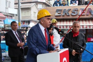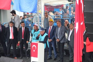 İstiklal Marşı’nın ardından 1 Mayıs Komitesi adına platformda konuşma yapan TTMOB Maden Mühendisleri Odası Başkanı Erdoğan Kaymakçı; “Bu alanda işçiler, emekçiler, memurlar, mühendisler, öğrenciler ve esnafımız ile yan yana olmak çok güzel, bu meydan sizinle çok daha güzel. Buradan dünyanın dört bir yanında emeği ile geçinen, emeği için mücadele eden tüm işçileri, işçi sınıfını selamlıyoruz.” dedi. Konuşmasında Türkiye’nin içinden geçtiği durumla ilgili de konuşan Kaymakçı, TTK’nın ve madenlerin özelleştirme gündemine değinerek; “Bu özelleştirmelerin ne olduğunun sonuçlarnı ağır ödedik. Ayrıca sadece Madenler değil Şeker Fabrikaları da bugün satılıyor, elimizde olan tüm değerler elden çıkartılıyor. Biz bunun karşısındayız.” dedi.