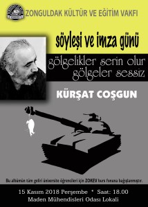 Karikatürist Kürşat Coşgun’un ZOKEV Yayınları arasında çıkan “Gölgelikler Serin Olur Gölgeler Sessiz” adlı albümün tanıtım ve imza günü 15 Kasım’da yapılıyor. Coşgun albümün tüm gelirini ZOKEV burs fonuna bağışladı