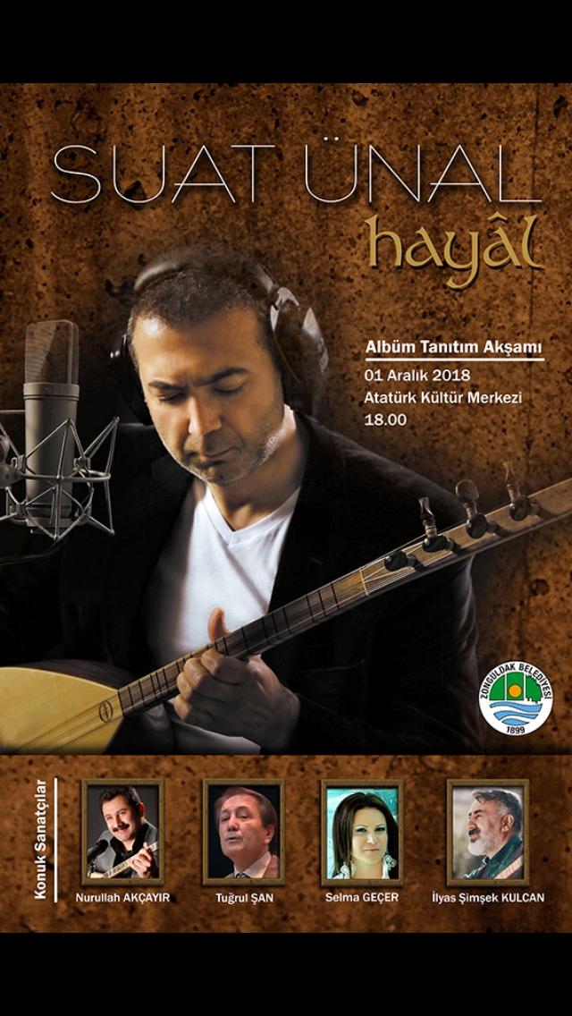 Zonguldaklı müzikseverlerin yakından tanıdığı, Zonguldak Atatürk Anadolu Lisesi Edebiyat Öğretmeni Suat Ünal, uzun zamandır hazırlıklarını sürdürdüğü “Hayal” adlı ilk albümünü gün yüzüne çıkarıyor. Albümün tanıtım konseri 1 Aralık Cumartesi günü Atatürk Kültür Merkezi’nde yapılıyor. Saat 18.00’de başlayacak olan konsere Türk Halk Müziği’nin ünlü sesleri Tuğrul Şan, Nurullah Akçayır, Selma Geçer ve İlyas Şimşek Kulcan da konuk sanatçı olarak katılıyor.