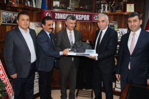 GMİS Genel Başkanı Ahmet Demirci, Vali Erdoğan Bektaş’a Sendikanın yayınları ve raporlarından oluşan bir kitap seti, üzerinde maden şehitlerinin isimlerinin yazılı olduğu Zonguldak Kömürspor Forması, madenci bareti ile TTK Armutçuk Müessesesi’ne bağlı ocaktan çıkarılmış parça kömür takdim etti.