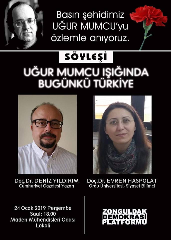 24 Ocak 2019 Perşembe günü saat 18.00’de ise Maden Mühendisleri Lokalinde, Ordu Üniversitesinden Siyaset Bilimci Doç. Dr. Evren Haspolat ve Cumhuriyet gazetesi yazarı Doç. Dr. Deniz Yıldırım’ın katılımıyla “Uğur Mumcu Işığında Bugünkü Türkiye” başlıklı söyleşi yapılacak. Zonguldak Demokrasi Platformu, her iki etkinliğe de katılım çağrısı yaptı.