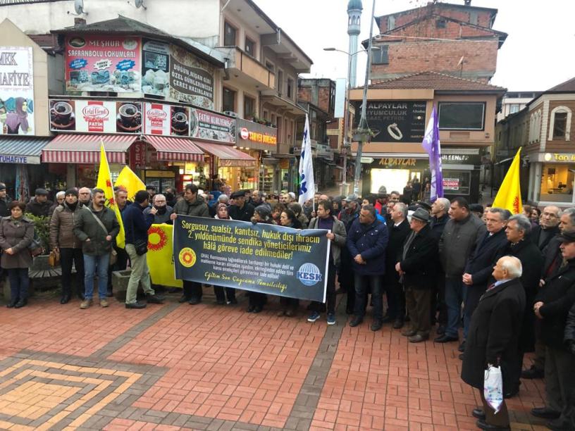 7 Şubat 2017 tarihinde yayınlanan 686 sayılı KHK ile ihraç edilen ancak savcılığın takipsizlik kararına ve haklarında herhangi adli ve idari işlem yapılmamasına rağmen görevlerine iade edilmeyen Eğitim Sen Zonguldak Şube Sekreteri İsmet Akyol ve Eğitim Sen Çaycuma Temsilcisi Gökhan Taner Günsan’ın ihraç edilmelerinin ikinci yılında Çaycuma’da basın açıklaması yapıldı.