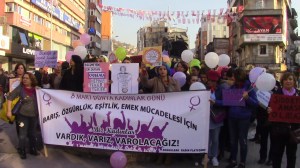 Esnek, kuralsız, güvencesiz, kayıt dışı ve düşük ücretlerle sömürülmeye, ekonomik krizle birlikte daha fazla yoksullaşmaya, çalışma yaşamının ayrılmaz parçası haline getirilmiş baskı, şiddet ve mobbinge, kreşleri kapatıp kadınlara yüklenmeye çalışılan bakım hizmetleri nedeniyle ücretli işlerde çalışmamızı engelleyen politikalara karşı durmaya, ev içerisinde görünmez kılınıp değersizleştirilen emeğimize sahip çıkarak mücadelemizi yürütüyoruz”dedi ve taleplerini sıraladılar.