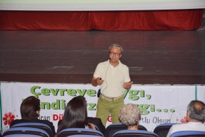 Dünya Çevre Günü etkinlikleri kapsamında Çaycuma Belediyesinin konuğu olarak bir konferans veren Ege Üniversitesi Halk Sağlığı Ana Bilim Dalı eski Başkanı Prof. Dr. Ali Osman Karababa dünyanın çok büyük bir ekolojik tehdit altında olduğunu söyledi. Çaycuma Belediye Başkan Vekili Cengiz Gökçe, CHP Çaycuma İlçe Başkanı Şeref Köktürk, Çaycuma Kent Konseyi Başkanı Berna Çimsalan Özyurt ve öğrencilerle ilgili bir kalabalığın izlediği konferans Çaycuma Kültür ve Sanat Merkezi’nde yapıldı. Sunumuna Filyos Vadisi’nden çekilmiş fotoğraflarla başlayan Karababa, Filyos Vadisi Projesi ile buralara sanayi tesisi planlanmasının yanlış olduğunu söyledi. Irmağın oluşturduğu toprağın çok değerli olduğunu söyleyen Karababa, tarım topraklarının mutlaka korunması gerektiğini dile getirdi. Çevrenin, çevreleyen ve çevrelenen olmak üzere iki öğesi olduğunu söyleyen Karababa, “Genellikle çevrelenen bir organizma yani biziz. Çevreleyen de onun geliştiği ve faaliyet gösterdiği ortamı anlatmaktadır. Çevre sözcüğü organizmanın dışında kalan ve organizmanın biyolojik doğasını etkileyen bütün faktörleri kapsar. Çevre Kanunu ise çevreyi, canlıların yaşamları boyunca ilişkilerini sürdürdükleri ve karşılıklı olarak etkileşim içinde bulundukları biyolojik, fiziksel, sosyal, ekonomik ve kültürel ortam olarak açıklar. Ekoloji ise Canlıların hem kendi aralarındaki hem de çevreleriyle olan ilişkilerini tek tek veya birlikte inceleyen bilim dalıdır. Bu ilişkiler birey ile başlar biyosfere kadar devam eder” dedi.