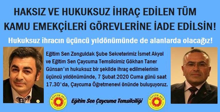Eğitim-Sen Çay76cuma temsilciliği konuyla ilgili yaptığı duyuruda şu bilgilere yer verdi, “7 Şubat 2017 tarihinde yayınlanan 686 sayılı OHAL KHK’si ile hukuksuz bir şekilde ihraç edilen Eğitim Sen Zonguldak Şube Sekreterimiz İsmet Akyol ve Eğitim Sen Çaycuma Temsilcimiz Gökhan Taner Günsan’ın ihraç edilmelerinin üçüncü yıldönümünde, 7 Şubat 2020 Cuma günü saat 17.30’da Çaycuma Öğretmenevi önünde buluşuyoruz.