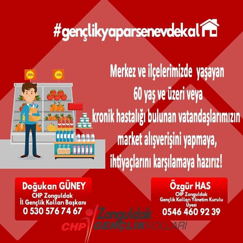 Cumhuriyet Halk Partisi (CHP) Zonguldak il Başkanlığından yapılan bir açıklama ile parti gençlik kollarının evlerinde kalmaları zorunlu tutulan 65 yaş üstü vatandaşların hizmetinde olacağı belirtildi.