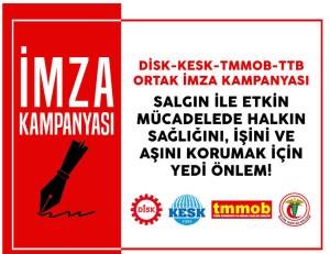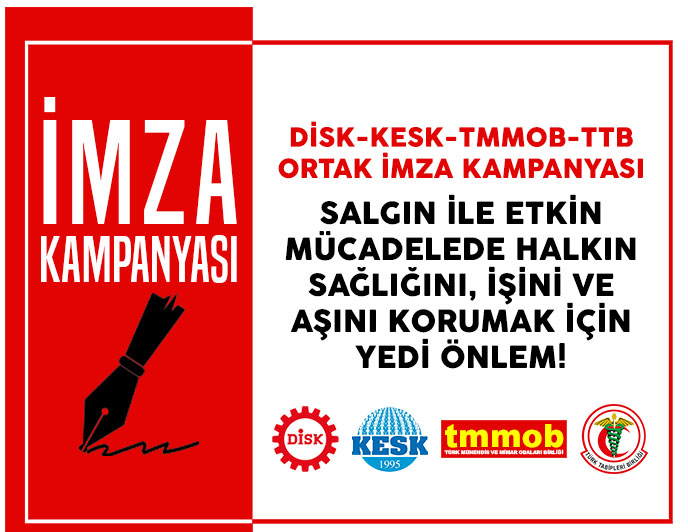 DİSK, KESK, TMMOB ve TTB, Covid-19 salgını ile etkin mücadelede halkın sağlığını, işini ve aşını korumak için 7 önlem açıkladı. Kişi ve kurumların imzasına açılan ortak metni ve imza formunu yayımlıyoruz.