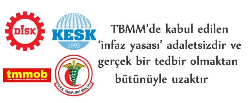 DİSK, KESK, TMMOB ve TTB tarafından yapılan ortak açıklamada Covid-19 virüs salgınına ilişkin bir tedbir olarak gündeme getirilip TBMM’de kabul edilen ‘infaz yasası’nın adaletsiz ve gerçek bir tedbir olmaktan bütünüyle uzak olduğu belirtildi.