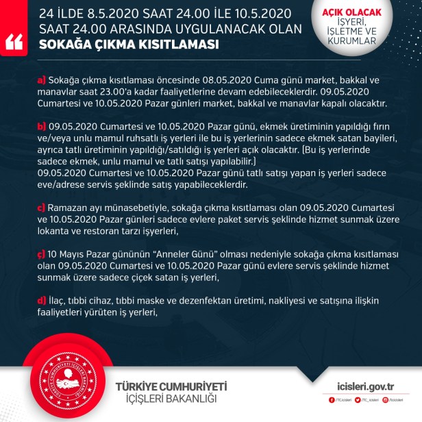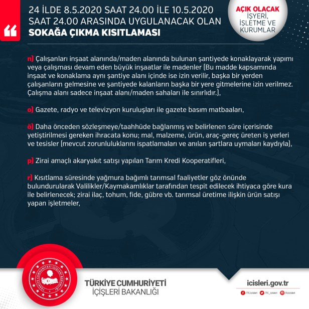 4 İlde 8 Mayıs 24.00 ile 10 Mayıs 24.00 saatleri arasında uygulanacak olan Sokağa Çıkma Kısıtlaması kapsamında iç işleri bakanlığı genelgesi yayınlandı