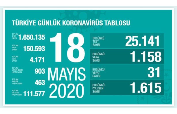 18 Mayıs: 1158 vaka, 33 ölüm (25.141 test) |