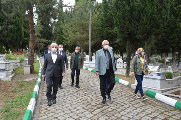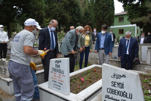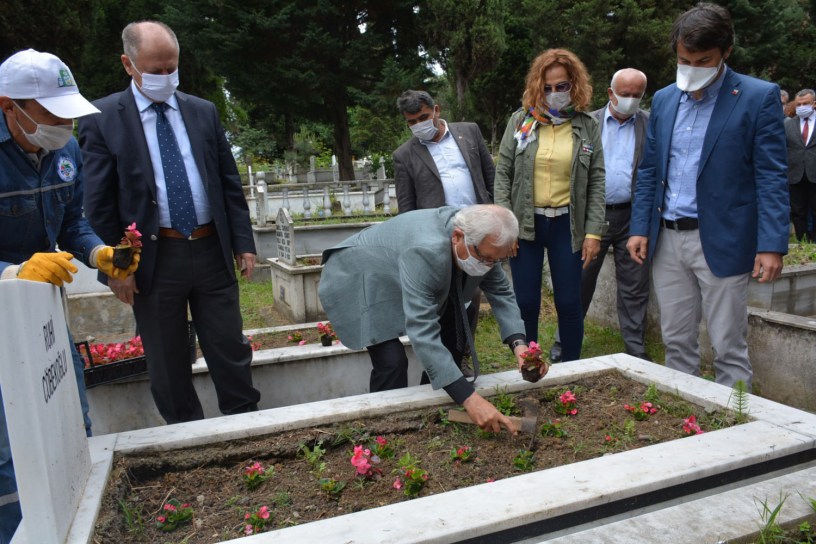 Daha sonra Kaymakam İsmail Çorumluoğlu, Belediye Başkanı Halil Posbıyık ve eşi Neriman Posbıyık birlikte uzun yıllar Kdz. Ereğli Belediye Başkanlığı yapan Ruhi Cöbekoğlu’nun mezarına çiçek diktiler.