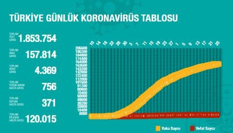 Açıklanan rakamlara göre, bugüne kadar 1 milyon 853 bin 754 kişiye test yapıldı. Toplam vaka sayısı 157.814, Covid-19 nedeniyle ölen kişi sayısı ise 4.369 olarak açıklandı.