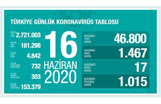 16 Haziran: 1467 vaka, 17 ölüm (46.800 test)