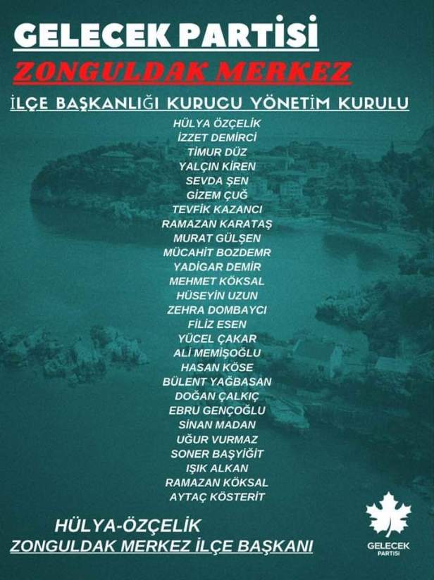 Genel Başkanlığını eski Başbakan Ahmet Davutoğlu, Zonguldak İl Başkanlığını Hikmet Aydın’ın yaptığı Gelecek Partisi’nin Zonguldak Merkez İlçe Başkanlığı’na Hülya Özçelik atandı.İsimler arasında ANAP Eski İl Başkanı İzzet Demirci ve CHP Üyesi Yalçın Kiren’in olması dikkat çekti