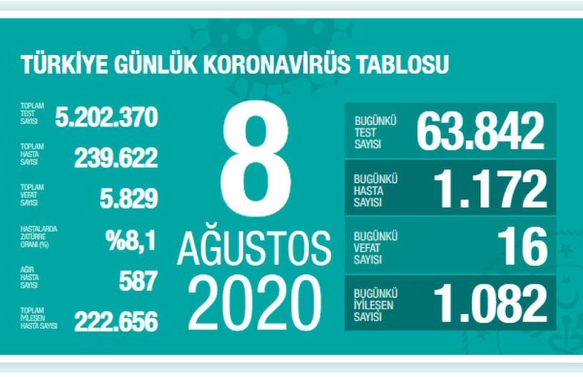 Son 24 saatte 1.172 yeni vaka, 16 ölüm Türkiye’de bugüne kadar 239 bin 622 kişide Covid-19 tespit edildiği ve virüs nedeniyle 5 bin 829 kişinin hayatını kaybettiği açıklandı.