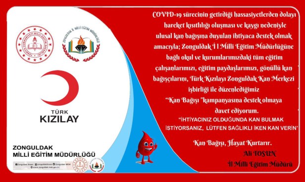 Zonguldak İl Milli Eğitim Müdürlüğü, Türk Kızılayı Zonguldak Kan Merkezi ile işbirliği yaparak Kan Bağışı Kampanyası başlattı. COVID-19 sürecinin getirdiği hassasiyetlerden dolayı hareket kısıtlılığı oluşması ve kaygı nedeniyle ulusal kan bağışına duyulan ihtiyaca destek olmak amacıyla; İl Milli Eğitim Müdürü Ali TOSUN öncülüğünde başlatılan Kan Bağışı kampanyasına, Zonguldak İl Milli Eğitim Müdürlüğüne bağlı okul ve kurumlarındaki tüm eğitim çalışanları, eğitim paydaşları ve gönüllü Kan Bağışçıları katılacaktır.