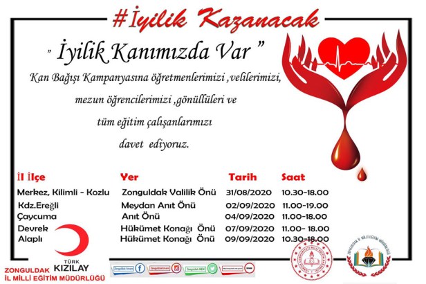 Kan Bağışları Merkez-Kilimli-Kozlu ilçeleri Zonguldak Valiliği Önünde 31 Ağustos 2020 Pazartesi günü 10.30-18.00 saatleri arasında, Kdz. Ereğli Meydan Anıtı Önünde 02.09.2020 Çarşamba günü 11.00-19.00 saatleri arasında, Çaycuma’da 04.09.2020 Cuma günü 11.00-18.00 saatleri arasında, Devrek Hükümet Konağı Önünde 07.09.2020 Pazartesi günü 11.00-18.00 saatleri arasında, Alaplı Hükümet Konağı Önünde 09.09.2020 Çarşamba günü 10.30-18.00 saatleri arasında yapılacaktır. İl Milli Eğitim Müdürü Ali TOSUN; “Bu Kan Bağışı kampanyasının bugünlerde çok daha anlamlı olduğunu” belirterek tüm eğitim yöneticilerini, Öğretmenleri, eğitim çalışanlarını Kan Bağışı kampanyasına destek olmaya davet ettiğini söyledi.