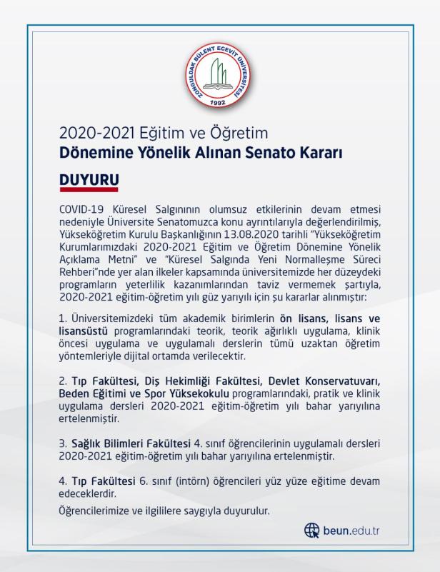Bülent Ecevit Üniversitesi uzaktan eğitim kararı aldı. Üniversite senato kararının ardından resmi açıklama sabah saatlerinde yayımlandı.