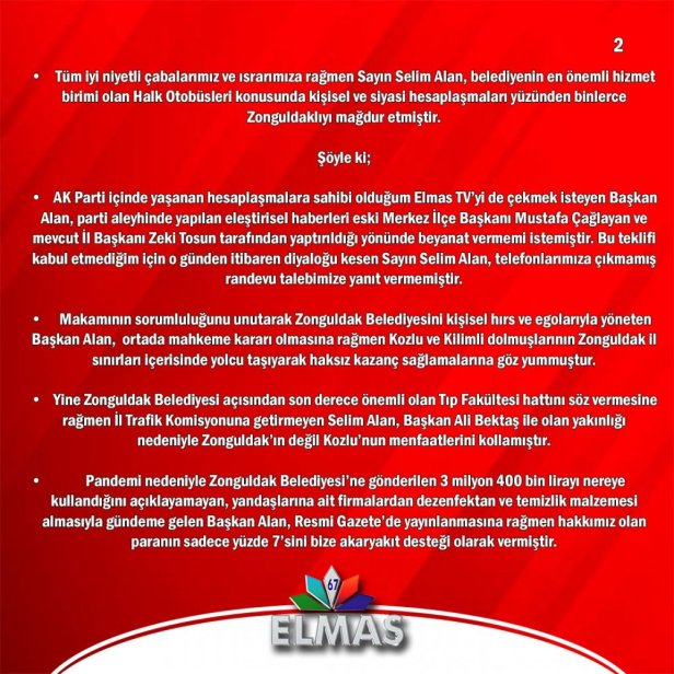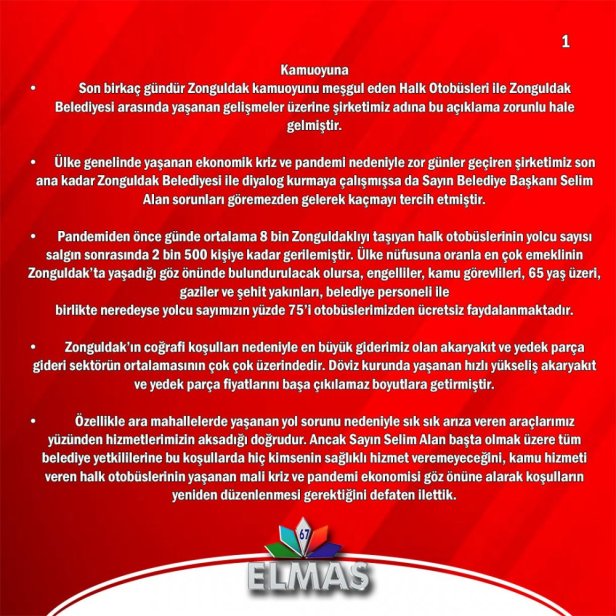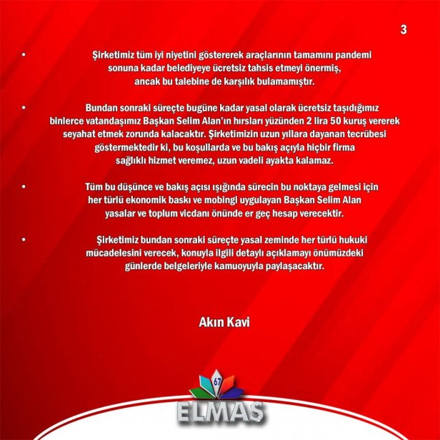Zonguldak Belediye Özel Halk otobüsleri işletmecisi Akın Kavi, Özel Halk Otobüslerinin sözleşmeyi feshetmesinin ardından Belediye Başkanı Ömer Selim Alan’a cevap verdi. Elmas TV’de yayınlanan Akın Kavi’nin açıklaması şu şekilde;