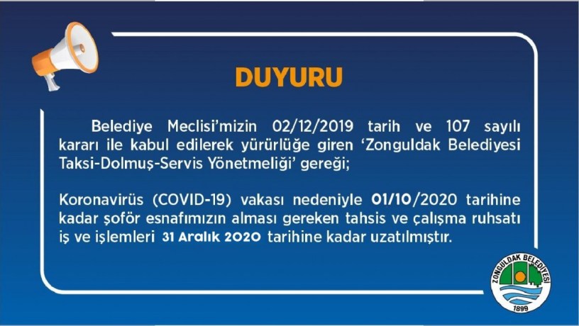 Zonguldak Belediyesi’nden yapılan duyuruda; Belediye Meclisi’nin 2 Aralık 2019 tarih ve 107 asayılı kararı ile kabul edilerek yürürlüğe giren; Zonguldak Belediyesi taksi, dolmuş, servis yönetmeliği gereği şoför esnafının 1 Ekim 2020 tarihine kadar alması gereken tahsis ve çalışma ruhsatı iş ve işlemleri Corona Virüs süreci nedeniyle 31 Aralık 2020 tarihine kadar uzatıldığı açıklandı.