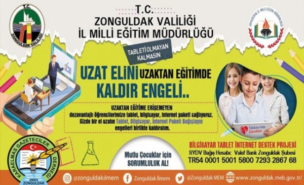Zonguldak’ta görev yapan gazeteciler, Zonguldak Valiliği ve İl Milli Eğitim Müdürlüğü tarafından ‘Tableti olmayan kalmasın. Uzat elini uzaktan eğitimde kaldır engeli’ kampanyasına destek için ortak yayında buluşuyor.