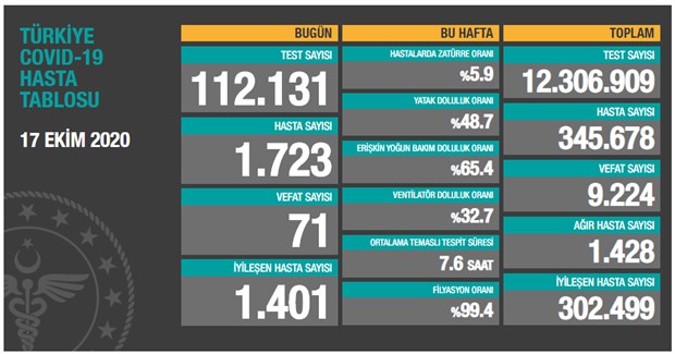Sağlık Bakanı Fahrettin Koca, Twitter hesabından yaptığı değerlendirmede, “Bugün yapılan testlerde 1.723 yeni hasta tespit edildi. Ağır hasta sayısını düşürecek olan hastalığın bulaş yollarını engellemektir. Bunun için şuan en önemli silahımız tedbirlere birlikte uymak. Tedbirlere uyarsak kazanan biz olacağız” dedi.