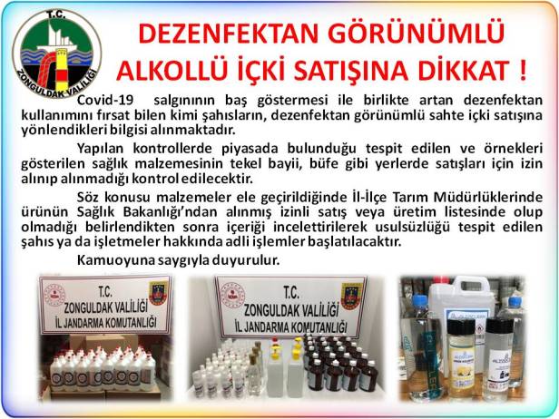 Zonguldak Valiliği tarafından dezenfektan görünümündeki alkollü içki satışına karşı vatandaşlar uyarıldı.