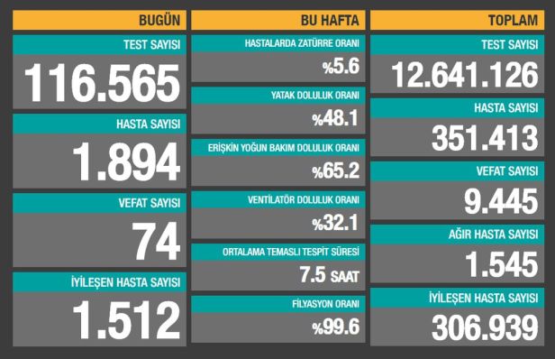 Bakanlık, son 24 saatte 116.565 test yapıldığını, 1.894 yeni hasta tespit edildiğini, 74 kişinin hayatını kaybettiğini, 1.512 hastanın iyileştiğini açıkladı.