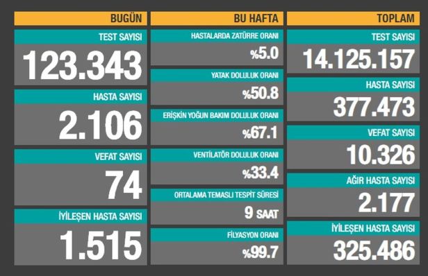 Bakanlık, son 24 saatte 123.343 test yapıldığını, 2.106 yeni hasta tespit edildiğini, 74 kişinin hayatını kaybettiğini, 1.515 hastanın iyileştiğini açıkladı.
