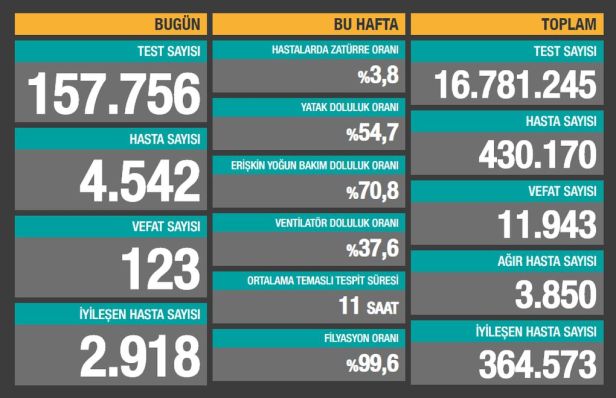 Bakanlık, son 24 saatte 157.756 test yapıldığını, 4.542 yeni hasta tespit edildiğini, 123 kişinin hayatını kaybettiğini, 2.918 hastanın iyileştiğini açıkladı.