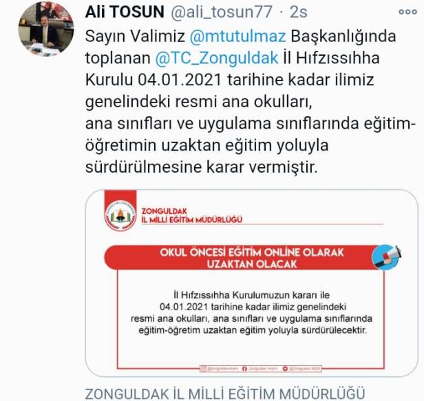 Zonguldak İl Milli Eğitim Müdürü Ali Tosun, Zonguldak İl Hıfzıssıhha Kurulunca, okul öncesinde uzaktan eğitim kararı alındığını bildirdi. Zonguldak İl Hıfzıssıhha Kurulu kararını sosyal medyadan duyuran Ali Tosun şunları söyledi: “Sayın Valimiz Mustafa Tutulmaz Başkanlığında toplanan Zonguldak İl Hıfzıssıhha Kurulu 04.01.2021 tarihine kadar ilimiz genelindeki resmi ana okulları, ana sınıfları ve uygulama sınıflarında eğitim- öğretimin uzaktan eğitim yoluyla sürdürülmesine karar vermiştir.”dedi.