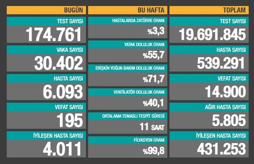 Sağlık Bakanlığı son 24 saatte 174.761 test yapıldığını, 30.402 kişiye Covid-19 tanısı konduğunu, 6.093 kişinin “hasta” kabul edildiğini, 195 kişinin de Covid-19 nedeniyle öldüğünü açıkladı.