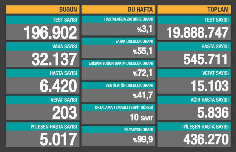 Sağlık Bakanlığı son 24 saatte 196.902 test yapıldığını, 32.137 kişiye Covid-19 tanısı konduğunu, 6.420 kişinin “hasta” kabul edildiğini, 203 kişinin de Covid-19 nedeniyle öldüğünü açıkladı.