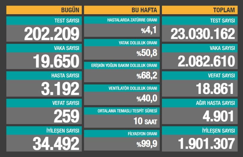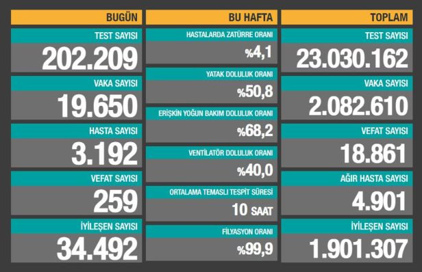 Sağlık Bakanlığı son 24 saatte 202.209 test yapıldığını, 19.650 kişiye Covid-19 tanısı konduğunu, 3.192 kişinin “hasta” kabul edildiğini, 259 kişinin de Covid-19 nedeniyle öldüğünü açıkladı.