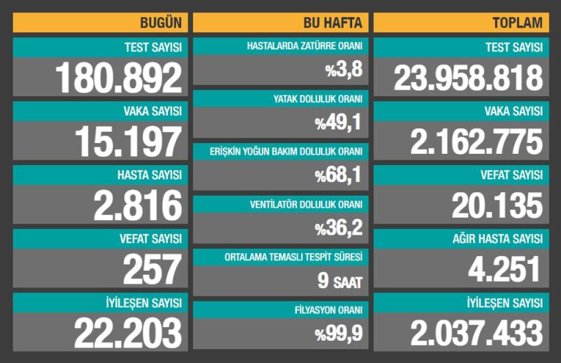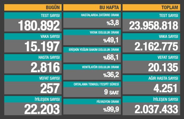 Sağlık Bakanlığı son 24 saatte 180.892 test yapıldığını, 15.197 kişiye Covid-19 tanısı konduğunu, 2.816 kişinin “hasta” kabul edildiğini, 257 kişinin de Covid-19 nedeniyle öldüğünü açıkladı.