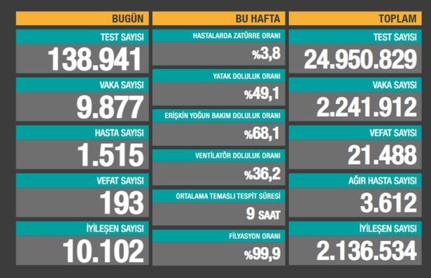 Buna göre Bakanlık, son 24 saatte 138.941 test yapıldığını, 9.877 kişiye Covid-19 tanısı konduğunu, bunlardan 1.515 kişinin Covid-19 hastası kabul edildiğini, 193 kişinin salgın nedeniyle hayatını kaybettiğini, 10.102 kişinin iyileştiğini, 3.612 Covid-19 hastasının durumunun ağır olduğunu açıkladı.