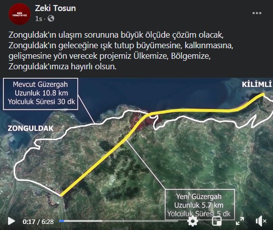 Tosun paylaşımında “Zonguldak’ın ulaşım sorununa büyük ölçüde çözüm olacak. Zonguldak’ın geleceğine ışık tutup büyümesine, kalkınmasına, gelişmesine yön verecek projemiz Ülkemize, Bölgemize, Zonguldak’ımıza hayırlı olsun” diye ifade etti