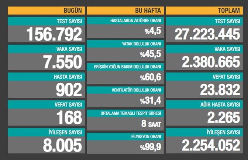 Sağlık Bakanlığı son 24 saatte 156.792 test yapıldığını, 7.550 kişiye Covid-19 tanısı konduğunu, 902 kişinin “hasta” kabul edildiğini, 168 kişinin de Covid-19 nedeniyle öldüğünü açıkladı.