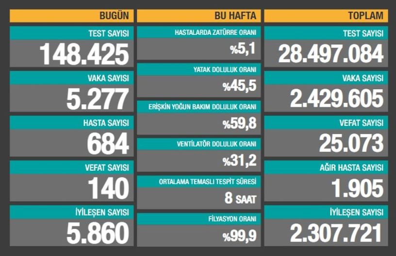 Sağlık Bakanlığı son 24 saatte 148.425 test yapıldığını, 5.277 kişiye Covid-19 tanısı konduğunu, 684 kişinin “hasta” kabul edildiğini, 140 kişinin de Covid-19 nedeniyle öldüğünü açıkladı.