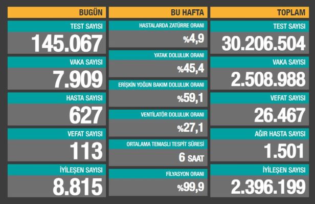Sağlık Bakanlığı son 24 saatte 145.067 test yapıldığını, 7.909 kişiye Covid-19 tanısı konduğunu, 627 kişinin “hasta” kabul edildiğini, 113 kişinin de Covid-19 nedeniyle öldüğünü açıkladı.