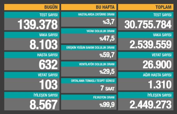 Sağlık Bakanlığı son 24 saatte 139.378 test yapıldığını, 8.103 kişiye Covid-19 tanısı konduğunu, 632 kişinin “hasta” kabul edildiğini, 103 kişinin de Covid-19 nedeniyle öldüğünü açıkladı.